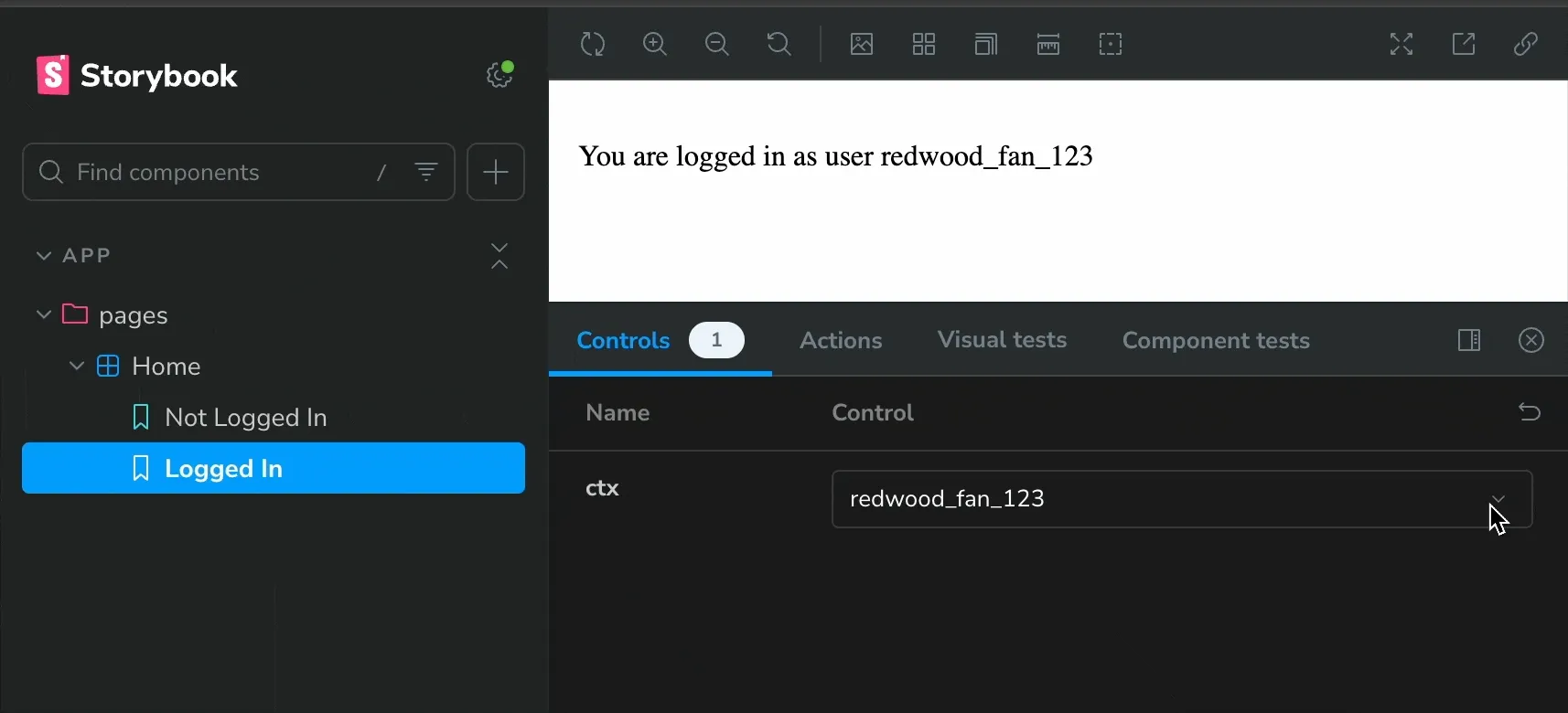 3. Great! What if we want to mock the logged in user? We can do that by adding a new story, this time passing in a user object to the ctx prop: