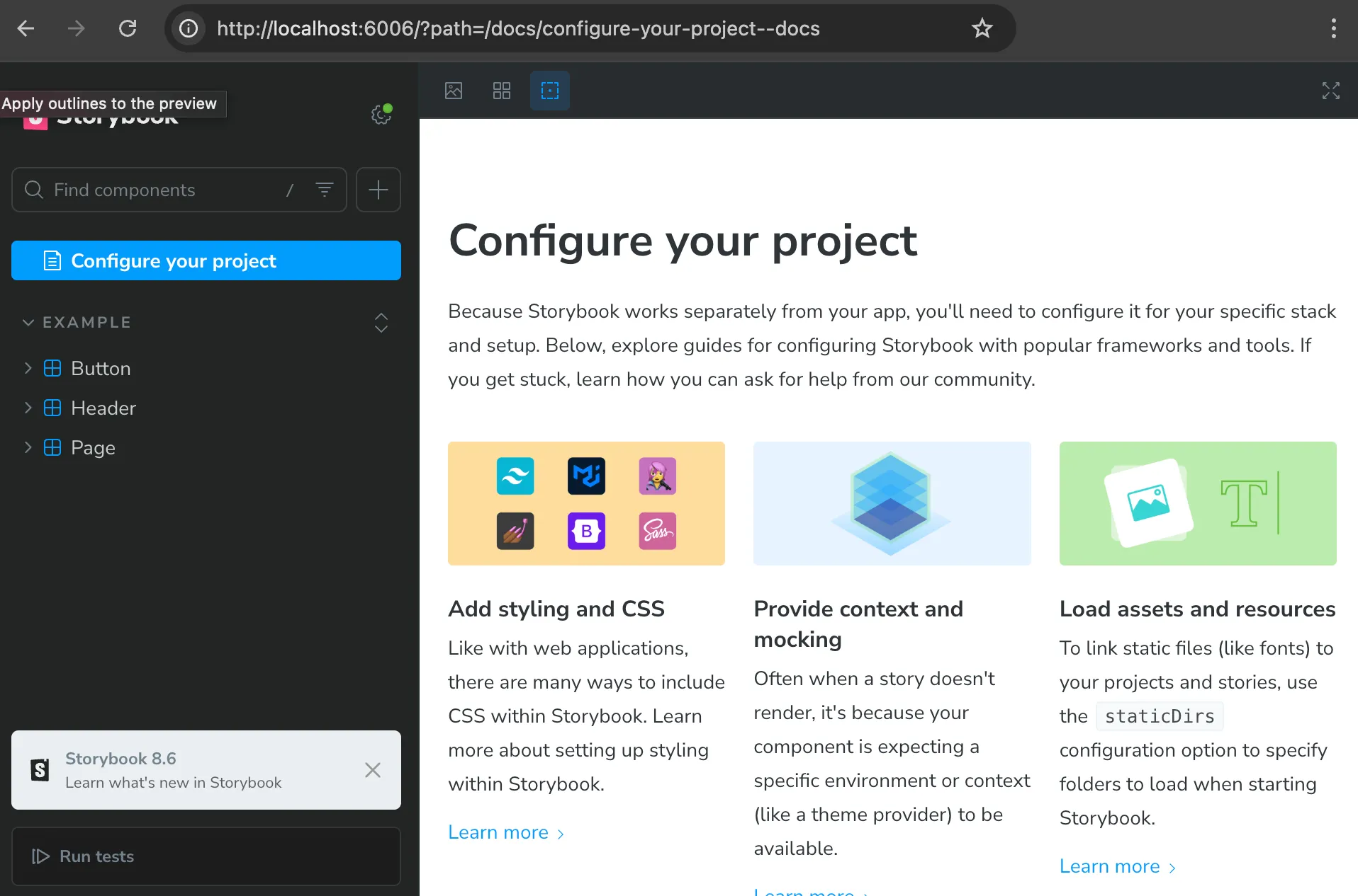 5. It should automatically open our browser to Storybook, and if it doesn’t, we can go to localhost:6006 to see it: